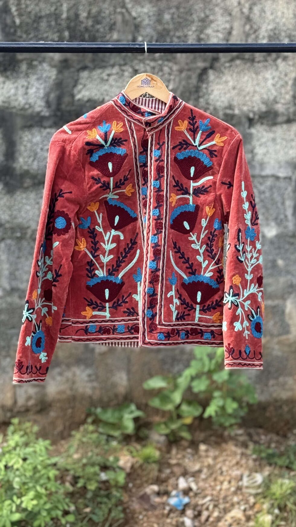 Womens Terracotta Velvet Embroidered Jacket with Floral Design